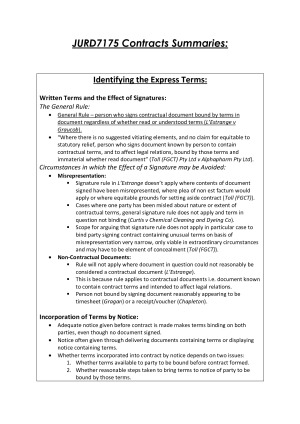 These notes are an excellent summary of all course content utilising a combination of the text and case books. They provide a concise explanation of all aspects of the course, with relevant legislation and cases cited where necessary. Topics included are identifying the express terms, construction, implied terms, frustration, termination, damages, limits on damages and vitiating factors.
