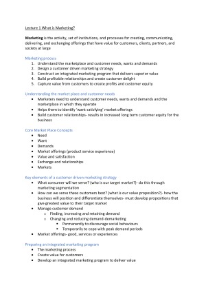 very concise and easy to read!! All weekly lectures covered and everything you need to know for the exam! Topic List: -What is marketing? -Planning strategy and marketing environment -Marketing research -Consumer behaviour -Segmentation, targeting and positioning -Product -Price -Place -Promotion -Sustainable marketing