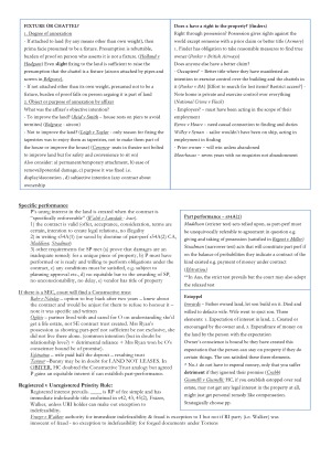 Includes everything you need to nail that exam... in a concise six-page summary. For Property Law at ANU you are only allowed to bring three pages of double-sided notes. I worked really hard on making this summary to fully prepare me for the exam. It is methodical in order, has all the rules, exceptions, detailed steps to satisfy a test, all the cases and how it's relevant to the issue (so you can drop a quick line analogising to the facts and the lecturer will think you know the case well). For a three page cheat sheet it surprisingly fits a lot, and you'll be sure to set yourself up for success with these notes!