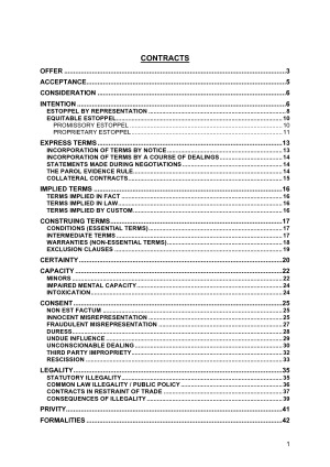 Complete summary covering the entire Contracts semester from beginning to end, including ALL relevant authorities for assignments and final exam. This summary incorporates notes from the required readings, additional readings, case books, lecture slides and tutorials. Contracts is a content-dense subject so a perfect, concise set of notes is exactly what you need to ace the subject! This summary covers: - Offer - Acceptance - Consideration - Intention - Estoppel by Representation - Equitable Estoppel - Promissory Estoppel - Proprietary Estoppel - Express Terms - Incorporation of Terms by Notice - Incorporation of Terms by a Course of Dealings - Statements Made During Negotiations - The Parol Evidence Rule - Collateral Contracts - Implied Terms - Terms Implied In Fact - Terms Implied In Law - Terms Implied By Custom - Construing Terms - Conditions (Essential Terms) - Intermediate Terms - Warranties (Non-Essential Terms) - Exclusion Clauses - Certainty - Capacity - Minors - Impaired Mental Capacity - Intoxication - Consent - Non Est Factum - Innocent Misrepresentation - Fraudulent Misrepresentation - Duress - Undue Influence - Unconscionable Dealing - Third Party Impropriety - Rescission - Legality - Statutory Illegality - Common Law Illegality / Public Policy - Contracts In Restraint Of Trade - Consequences Of Illegality - Privity - Formalities - Discharging Contracts - Actual Breach of Contract - Anticipatory Breach of Contract (Repudiation) - Consequences of Affirmation or Termination - Termination by Agreement - Abandonment - Frustration - Remedies for Breach of Contract - Termination - Rights Conferred by The Common Law - Termination for Delay - Restrictions On the Right to Terminate - Actions for Debt - Quantum Meruit (Restitution)