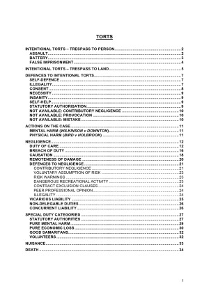 Complete summary covering the entire Torts semester from beginning to end, including ALL relevant authorities for assignments and final exam. This summary is in the exact structure that you will be required to use in the final exam in order to maximise your marks. This summary incorporates notes from the required readings, additional readings, case books, lecture slides and tutorials. Torts is a content-dense subject so a perfect, concise set of notes is exactly what you need to ace the subject! This summary covers: - Intentional Torts – Trespass to Person - Assault - Battery - False Imprisonment - Intentional Torts – Trespass to Land - Defences to Intentional Torts - Self-Defence - Illegality - Consent - Necessity - Insanity - Self-Help - Statutory Authorisation - Contributory Negligence - Provocation - Mistake - Actions On the Case - Mental Harm (Wilkinson v Downton) - Physical Harm (Bird v Holbrook) - Negligence - Duty of Care - Breach of Duty - Causation - Remoteness of Damage - Defences to Negligence - Contributory Negligence - Voluntary Assumption of Risk - Risk Warnings - Dangerous Recreational Activity - Contract Exclusion Clauses - Peer Professional Opinion - Illegality - Vicarious Liability - Non-Delegable Duties - Concurrent Liability - Special Duty Categories - Statutory Authorities - Pure Mental Harm - Pure Economic Loss - Good Samaritans - Volunteers - Nuisance - Death
