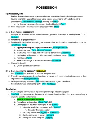 Full notes in exam structure, including some POLICY arguments. I taught Property Law in 2017 and have thus updated my notes accordingly. Therefore it should cover all the content subject to any new changes in the 2018 syllabus, but may be presented in a different order to the new syllabus. Topics: [1] Concepts of property - What is property - Theories of private property - Characteristics of property - Subjects & objects of property - Recognising new proprietary interests - Constitutional protection of property rights - Classification of property - Chattels/fixtures [2] Fragmentation of proprietary interests [3] Title - Native title - General law land - Torrens System [4] Equitable / legal interests in property - Trusts [5] Doctrine of tenures & estates - Freehold - Freehold vs leasehold - Future interests [6] Possession and doctrine of adverse possession - Possessory title - Adverse possession [7] Acquisition and transfer of property - Transferring proprietary interests - Formal requirements to transfer legal interests in land - Gifts of real and personal property - Sale of land (including Sale of Land Act) [8] Leases - Classifying leases - Characteristics of leases - Formal creation of leases - Leasehold covenants - Assignment of leases - Enforceability of lease covenants after assignment - Determination of leases - Regulation of leases [9] Creating leases - Legal leases - Equitable leases [10] Contractual licenses - Revoking licenses - Enforcing licenses against third parties [11] Easements - Characteristics - Scope - Creation - Extinguishment [12] Restrictive covenants [13] Mortgages