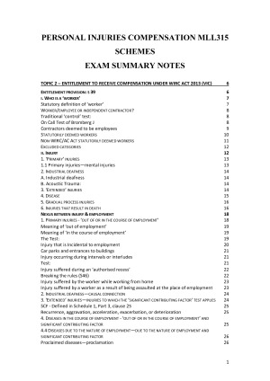 Personal Injuries & Compensation Schemes summary notes, perfect for exam study. Includes the possible exam question 'themes' to ensure you're prepared for the exam. These notes are comprehensive and integrate the prescribed readings, lecture notes, legislation, case summaries and revision slides.
