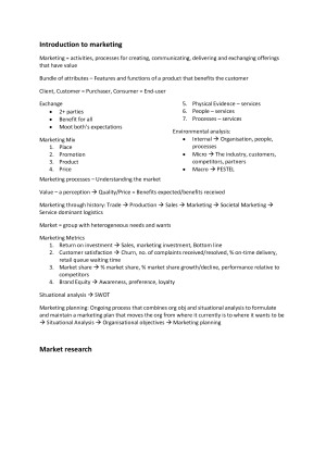 Covers all topics and weeks and includes information extracted from chapter readings Topic Covered -Market research -Consumer Behaviour -Markets: Segmentation, targeting, positioning -Marketing Mix – Product -Price -Promotion -Place -Services, Social & Not-for-profit marketing -Business buying behaviour -Digital and International Marketing