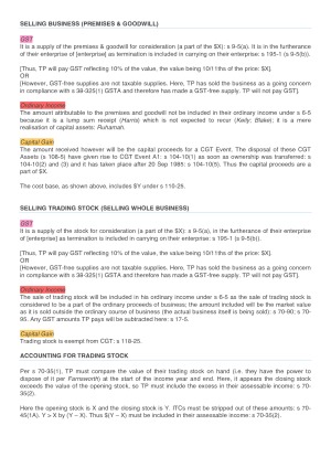 HOW TO USE: This script can be used for both the group assignment and the exam. The script contemplates up to 34 common/potential 'issues'/factual scenarios, and the relevant legislation and case law that comes up and what order to address every issue in. (For my exam, about 2/3s of it ended up coming up.) It is essentially a template for a typical exam. This should help reduce time spent on issue spotting 'per transaction' so you can get straight into legal analysis. Of course, exercise your discretion so you don't pigeonhole the facts, but you'll find that the majority of the tax exam can be scripted in advance (as I've done here). This is great if you happen to be running out of time and need to smash out analysis on transactions you've only identified but have yet to write about in detail, or if you have no idea what to talk about for a particular kind of transaction. It also provides a page to help you calculate tax liability which will be required of you in your exam. This script also gives you an idea of how I wrote in the exam and the extent of detail I addressed in order to achieve dux. :) Yay The following topics are considered in this script: CONTENTS: (1) GST (2) Income Tax - Ordinary Income - Statutory Income - Exempt Income / Non-assessable Non-exempt Income - General Deductions - Specific Deductions - Provisions Denying or Limiting Deductions - Tax Rates - Tax Offsets (3) Capital Allowance Regime - Depreciating Assets - Balancing Adjustments - Business-Related Blackhole Capital Expenditure - Capital Works - Trading Stock - Accounting for Trading Stock (4) Capital Gains Tax This is set out in the order you should apply the CGT regime to your exam scenario. (5) Taxation of Companies & Shareholders - Capital Returns - Corporate Tax Rate - Dividends - Imputation System (Frankable Distributions) - Franking Accounts (6) Taxation of Superannuation