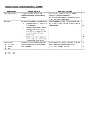 The following are covered in this document: - Medications to treat complications of ESKD (summary table detailing WHY medication is given, its mechanism of action, and which complication of ESKD it manages) - Mechanism and use of anti-hypertensives - A list of the cardiovascular complications of CKD (RG Week 2)
