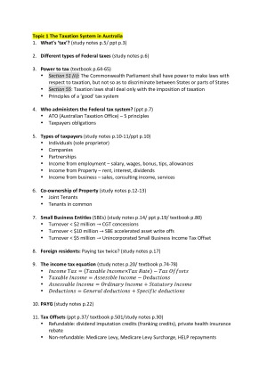 Here is my personal summary for the mid-term exam, including all the corresponding page number, section number, case study number etc. It can help you get to the right page quickly in the exam. It includes 4 topics, which is examinable: - Topic 1: The Taxation System in Australia - Topic 2: Residence and source, tax accounting - Topic 3: Income - Topic 4: Deductions