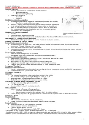 Complete lecture notes for PHYS30005 Sem 1, 2017. TOPICS: Lecture 1: Skeletal Muscle Structure-Function Lecture 2: Muscle Physiology Lecture 3: Muscle Injury Lecture 4: Muscle Regeneration Lecture 5: Skeletal Muscle Plasticity (Skeletal Muscle Adaptations to Increased or Deceased Use) Lecture 6: Skeletal Muscle Plasticity (Adaptations of Skeletal Muscle to Strength/Resistance and Endurance Training Lecture 7: Skeletal Muscle Fatigue Lecture 8: Ageing and Skeletal Muscle Lecture 9: Overview of Exercise Metabolism Lecture 10: Intracellular Signalling Lecture 11: Hormones and Exercise Lecture 12: Carbohydrate Metabolism During Exercise Lecture 13: Lipid Metabolism During Exercise Lecture 15: Protein Metabolism During Exercise Lecture 16: Regulation of Skeletal Muscle Mass Lecture 17: Skeletal Muscle Mass (Mechanisms of Atrophy) Lecture 18: Nutritional Interventions to Promote Changes in Muscle Metabolism Lecture 19: Cancer Cachexia Lecture 20: Inflammation Signalling in Skeletal Muscle Lecture 21: Key Functional Proteins in Skeletal Muscle Lecture 22: Growth Promoting Agents and Skeletal Muscle Lecture 24: Oxygen Uptake During Exercise Lecture 25: Cardiovascular Responses to Exercise Lecture 27: Respiratory Responses to Exercise Lecture 28: Maximal Oxygen Uptake: Determinants and Limits Lecture 29: Temperature and Fluid Balance During Exercise Lecture 30: Physiological Determinants of Exercise Performance Lecture 31: Exploring New Therapeutic Strategies for Muscle Lecture 32: Myogenesis – The Molecular Basis of Muscle Development Lecture 33: Myogenesis – From Stem Cells to Muscles Lecture 34: Transcriptional Regulation of Skeletal Muscle Stem-Cells Lecture 35: Metabolic Remodelling of Skeletal Muscle Stem Cells *Missing lectures were public holidays or midsem tests.