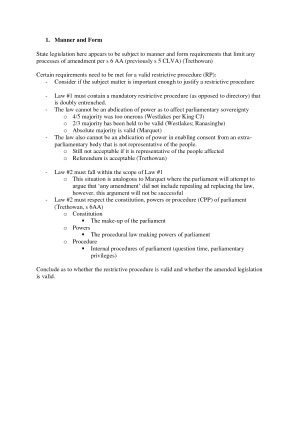 Constitutional law is all about spotting the issues and applying the law very quickly! Use this to understand fundamental concepts relevant to the exam - includes sections cited and relevant case law. Topics Covered State legislative power Manner and form Commonwealth legislative powers External affairs power Corporations Limits on Cth legislative power over the states Commercial financial grants to the states Executive Power of the Commonwealth Judicial Power Implied Political Freedoms Freedom of interstate trade & Commerce Inconsistency