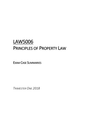 Exam case summaries created in Trimester 1 2018 for LAW5006 Principles of Property (Monash JD). These summaries are designed to give a clear outline of critical facts, what was held, the rationale of the decision and the key legal principle established. They also note the court, legal citation, and the name of the judge(s) involved in the decision. These Notes Include Cases On: -Concepts of Property -Classification -Estates and Goods -Leases and Licences -Leasehold Covenants -Adverse Possession -Land Transfers and Formalities -Easements -Profits A Prendre -Restrictive Covenants -Mortgages Note: For the best preview of the notes, view the 'preview' on a non-mobile device. Disclaimer: The accuracy of these notes is not guaranteed