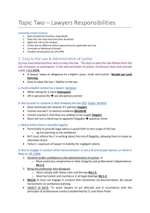 Notes are laid out in a way which makes it easy to follow in a take-home exam situation. Have pre-written sections where you can just add the facts to have a complete answer. Notes contain all examinable topics in a very thorough manner. Topics covered: Lawyers responsibilities Specific responsibilities for civil matters specific responsibilities for criminal matters Client responsibilities Conflicts of interest Trust accounting and costs Regulating the legal profession Admission to practice Complaints