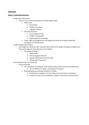 These notes over the whole semester's worth of content! 2 weeks are dedicated to negotiating, so there are 9 weeks of notes. At the bottom of the document there is also a huge table worth of practice questions I made with the help of my tutor to help prepare you for your exam revision. The topics covered are: - Self and Authenticity - Emotional Intelligence - Will Power & Work Motivation - Judgement & Decision-making - Social Networking, Power & Politics - Group and Team Dynamics - Leadership Excellence - Business Ethics - Negotiation