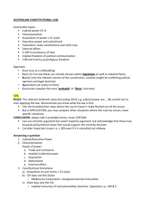 Completed ACL in the Autumn semester of 2017. Achieved a distinction (76) using these exam notes created by summarising the key concepts from all lectures, seminars and several textbooks. Begins with a clear step-by-step run through of how to approach a constitutional problem then covers the following topics: judicial power, characterisation, acquisition of power, executive power & nationhood, federalism (state constitutions & melb corp), external affairs, inconsistency of laws, implied freedom of political communication, trial by jury and religious freedom.