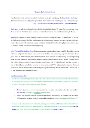 I received 95 as my overall grade for admin, with 70% of that grade an exam. These are the notes I took into the exam with me I know they are long, but organised properly they work. Includes cases, starter sentences, answer structures and policy considerations for the following topics: Topic 1 - Introduction and Overview Topic 1 - Introduction, Overview and the Role of Statutory Topic 2 - Ultra Vires (Grounds for Judicial Review I) Topic 3 - Jurisdictional Error (Grounds for Judicial Review II) Topic 4 - Procedural Fairness (Grounds for Judicial Review III) Topic 5 - Jurisdiction Topic 6 - Standing Topic 7 - Reasons Topic 8 - Remedies Topic 9 - Privative Clauses Topic 10 - Tribunals and Merits Review