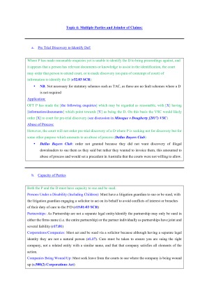 Sentence starts, cases, concepts, theory and policy and answer structure for the following topics: Topic 1: Disputes and the Civil Justice System Top of Form Bottom of Form Topic 3: Jurisdiction Topic 4 - (Multiple Parties and joinder (of claims) Topic 5 - Commencing proceedings, service and appearance Top of Form Bottom of Form Topic 7 - Defining the issues in dispute Top of Form Bottom of Form Topic 8- Methods of gathering evidence Top of Form Bottom of Form Topic 9 - Interlocutory applications Topic 10 - Disposition of disputes: Settle? Discontinue? Trial? Topic 12 - Costs Topic 13 - Enforcement Top of Form Bottom of Form Topic 14 - Appeals Anything in green you can cite verbatim in the exam and the blue you can substitute for the facts of your exam. These are the notes I took into the example, they are long but organised well they work!