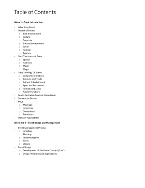 These notes contain a detailed summary of all content covered in TOUR1103. This is especially useful for revising for the end of semester exam. Table of Contents provides a summary of all major points covered in the semester. Notes are divided into sections, with each section focused on each week of the semester. The summary includes examples.