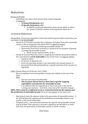 I achieved a 78 for this course. These notes are a combination of lecture notes, readings from the textbook and answers from tutorials. I also interviewed a director from Deloitte who is a specialist on the topic 'Tax motivated Profit shifting', with this information being included in my notes and very helpful for the final exam question. Topics include residence, assessable income and deductions, capital gains tax, partnerships, companies, trusts, capital allowance, trading stock and tax accounting, GST and anti-avoidance (tax).