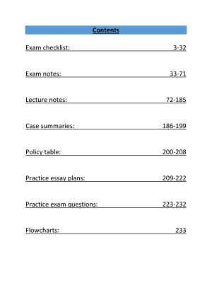 I received a HD in this class after bombing out on the mid semester assignment so these notes were my bible. I have included a checklist I have made which clarifies the elements that need to be met to satisfy all the topics covered, this includes sentence starters and case authorities so all you need to do is dump them straight onto paper and apply to facts. Ive also included comprehensive exam notes and my own lecture notes which were devised from multiple sources for difficult topics. Further, I have included case summaries (all cases on SRG) and a table that I made for the policy essay question on the exam that includes heaps of arguments to use as well as my own essay plans which detail how to answer a policy based question! Lastly I have included my own practice exam questions and answers.