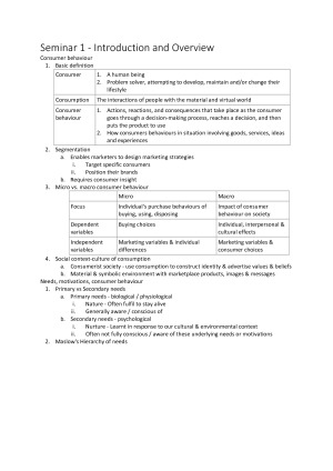 This is the completed lecture notes for MKTG90008 Consumer Behaviour. It is precise and includes diagrams, graphs and tables. It is perfect for previewing a lecture, assignments, revision and last-minute cramming. Topics: Seminar 1 - Introduction and Overview Seminar 2 - Decision Making and Consumption Experience Seminar 3 - Culture and Consumer Behaviour Seminar 4 - Reference Groups and Social Class Seminar 5 - N/A (Easter Holiday) Seminar 6 - N/A ( student presentation) Seminar 7 - Perception Seminar 8 - Personality and Self-Concept Seminar 9 - Learning & Memory Seminar 10 - Understanding & changing consumer attitudes Seminar 11- Symbolic Consumption Seminar 12 - N/A (revision week)