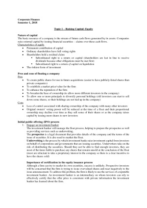 Comprehensive notes compiled from lectures, tutorial notes, readings and the textbook, complete with diagrams and exercises. Authored by a H1 student. Topics covered: 1 - Raising equity capital 2 - Debt and leases 3 - WACC and cap structure 4 - Payout policy 5 - ME projects with different lives 6 - Sensitivity/BE/Decision-tree 7 - Real options 8 - Takeovers 9 - Corporate restructuring 10 - Risk management