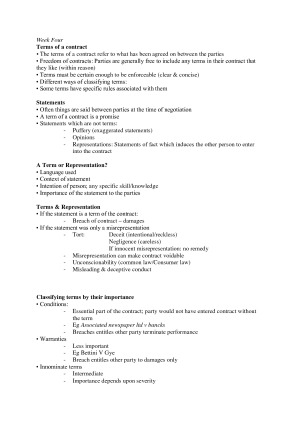 Week by week notes created from the text, classes and tutorials. Covers: Week 1: Forms of Law & Systems of Australian Gov Week 2: Sources of Law & Legislative process Week 3: Contracts & Intentions Week 4: Terms of a Contract Week 5: Contractual Obligations Week 6: Remedies of breach of contract Week 7: Vitiating Factors Week 8: Australian Consumer Law & (SOGA) Week 9: Misleading and Deceptive Conduct Week 10: Tort Law Week 11: Property Rights