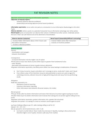 Covers all topics from weeks 1-12 including: - Objectives of financial reporting and information asymmetry - recognition and intangible assets - measurement - income and performance metrics and share market response - ratio analysis - earnings management - valuation - efficient markets - contracting - voluntary disclosure and regulation Combines lectures, tutorial work and all readings into comprehensive notes.