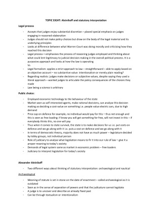 The following notes are an extensive guide to jurisprudence and include the quiz questions and answers as well as topic summaries Topics One and Two: Natural Law and Positivism Topics Three to Five: Judicial Discretion Topic Six and Seven: Constitutional Adjuciation Writing Correctly Topics Eight to Ten: Statutory and Constitutional Interpretation