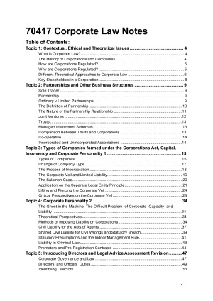 2017 Spring Corporate Law Notes: - Covers all cases studied in class - Complete summary of all the readings - Perfect for the mid sem assignment and final exam These notes are split into (theory notes and exam scaffolds) - see sample notes These notes are extremely useful. Particularly you might find the scaffolds and skeletons handy for the final exam. The scaffolds were made to adapt to any final exam question you get. With these notes I got an 86 in Corporate Law