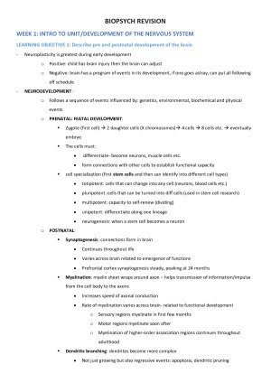 These are the biopsychology psy2061 unit for monash university. The notes are in the learning objective form for each week (1-12). The notes include the topics: 1. Introduction to the unit/Development of the nervous system 2. Research methods 3. Anatomy and Functions of the nervous system 4. Neural conduction and synaptic transmission 5. Sensory systems 6. Control of Action 7. Brain damage and neuroplasticity 8. Memory and amnesia 9. Drug addiction and the brain's reward circuits 10. Biopsychology of emotion, stress and health 11. Biopsychology of psychiatric disorders 12. Sleep, Dreaming and circadian rhythms
