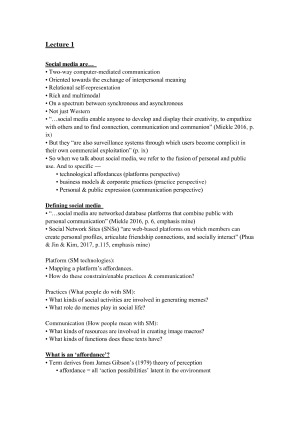 1. social media platforms, practices and affordances 2. the rhetoric of social sharing: telling stories with social media 3. imagined audiences and context collapse 4. networked publics and the blurring of public and private domains 5. social media influencers and attention economies 6. the curatorial self and the everyday aesthetics of social media 7. self-representation and selfies 8. analyzing opinion and emotion in social media communication 9. affect, affiliation and social media paralanguages 10. social metadata and social media metadiscourse 11. backchannel communication and two screen viewing