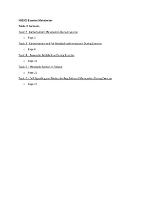 Exercise Metabolism Study Notes taken from lectures at Deakin University. Topics included: Topic 2 - Carbohydrate Metabolism During Exercise Topic 3 - Carbohydrate and Fat Metabolism Interactions During Exercise Topic 4 – Anaerobic Metabolism During Exercise Topic 5 – Metabolic Factors in Fatigue Topic 6 – Cell Signalling and Molecular Regulation of Metabolism During Exercise