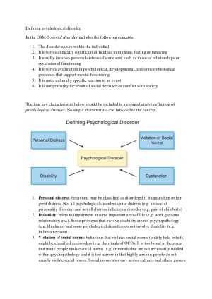 Detailed summary notes of Modules 1-6 including unit readings and videos. Used to get a HD on all weekly quizzes. Covers the following topics: Module 1: Introduction to Abnormal Psychology Module 2: Mood disorders/ Sleep disorders Module 3: Disorders of childhood/ Late-life disorders Module 4: Anxiety disorders/ Sexual dysfunctions and disorders Module 5: Personality disorders/ Eating disorders Module 6: Schizophrenia/ Substance-related disorders
