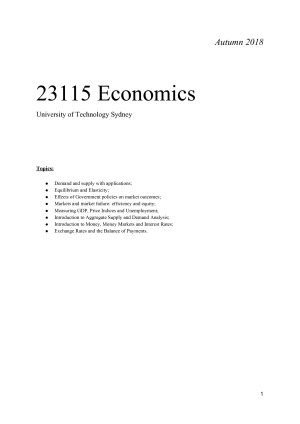 Extensive but well-condensed notes including detailed information on each topic to help you with study and preparation for your final exams! Includes diagrams and information to help you clearly understand the subject, and includes notes from all lectures, specifically topics: - Demand and supply with applications - Equilibrium and Elasticity - Effects of Government policies on market outcomes - Markets and market failure: efficiency and equity - Measuring GDP, Price Indices and Unemployment - Introduction to Aggregate Supply and Demand Analysis - Introduction to Money, Money Markets and Interest Rates - Exchange Rates and the Balance of Payments Good luck!