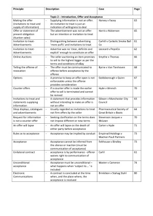 This was the best part of my notes. I used to be able to quickly refer to the appropriate cases and parts of the law needed in the exam. The table is set out with the relevant part of the law, a short description, relevant cases and the pg number. I managed to get a HD all throughout the semester using these case tables! This covers topics 2- 5 including the following: Topic 2 – Introduction, Offer and Acceptance Topic 3 – Intention, Consideration, Formalities, Capacity, Genuine Consent Topic 4 - Contract – Express and Implied Terms Topic 5 - Termination and Remedies