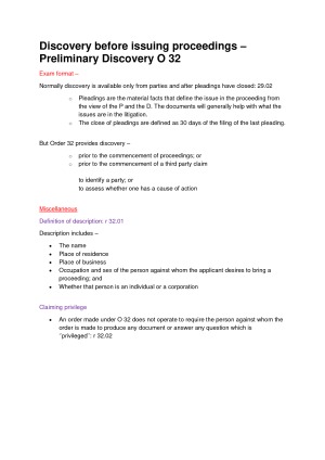 Includes all examinable topics. Step by step guidelines and easy to follow. All court rules have been included in the word document which were displayed in the lecture AND additional rules which were not specifically included in the lecture TOPICS ARE: Discovery (an example of comprehensivity): - ordinary discovery - discovery after issuing proceedings - notice requirements - general discovery and expanded discovery - privilege - documents not required by discovery - noncompliance Other topics: Interrogatories Disposition before trial Defaults and its procedure Summary judgments Interlocutory applications and orders Freezing orders and preservation orders Injunctions and adjournments Settlements and offers of compromise Calderbank offers and informal offers ADR Trial judgments and costs Splitting trials, failure to attend a trial and no case submissions Verdicts, reports, and judgments Setting aside and correcting judgments Costs after trial Penalties for choosing the wrong court Multiparty litigation Appeals and enforcement Powers of the Court of Appeal Warrants of seizure and sale