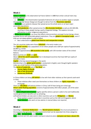 Full course notes including every weeks topics, perfect to use in companion with the online exam! Topics included are Introduction to a Global World, Development, The International Data Infrastructure, Refugees, Nationalism, Inequality, and Environment.