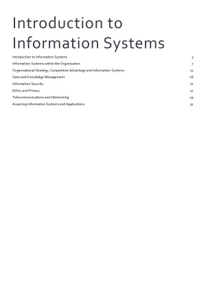 These are the notes I made and maintained throughout the semester, and contains all the topics assessable in the final exam. The topics are as follows: Introduction to Information Systems Information Systems within the Organisation Organisational Strategy, Competitive Advantage and Information Systems Data and Knowledge Management Information Security Ethics and Privacy Telecommunications and Networking Acquiring Information Systems and Applications As the final exam is completely unrestricted open book, I took this booklet into the exam and was able to complete all questions with a final HD mark and smashed the exam. If you buy these notes, you will be able to do the same. I found that the information in this booklet was able to let me answer each multiple choice question with confidence, as well as giving me the opportunity to write a lot for each short answer question. Another benefit of these notes is that real world examples and case studies are embedded throughout and can be used as an example in the final exam.