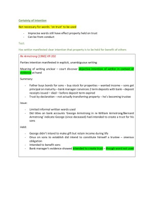 Consist of textbook summaries, step-by-step, examples, cases summaries and important points. 1. The Nature and Purpose of Trusts and Identifying Intention 2. Objects and Powers and Quistclose trusts 3. Statutory Formalities 4. Trustee’s Powers and Duties 5. Review of objects; Exercise of discretion and Quistclose trusts 6. Trustee’s Right of Indemnity