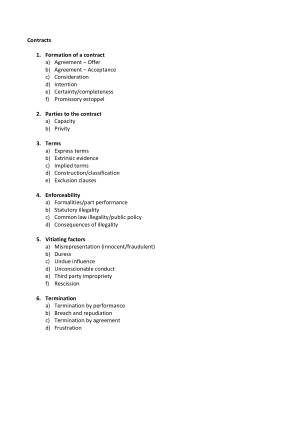 Completed Contracts in the Autumn semester of 2017. Achieved a distinction using these notes which I created by summarising the key concepts from my main set of notes. These notes are arranged in a chronological fashion, going through each step to a contract as you would in the final exam: Formation, Parties, Terms, Enforceability, Vitiating factors and Termination. Very clear and concise.