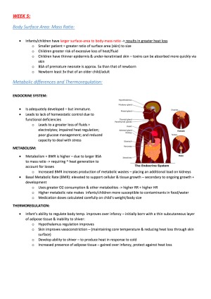 Week 1: - Contemporary Australian Families - Consent Laws - Child Maltreatment - Mandatory report in ward Week 2: - Safe sleeping practices+ SIDS - Stages of pregnancy - Foetal circulation - Assessment and care & Infant of birth - Nutrition Lecture notes Week 3: - Growth Assessment - Interpreting child growth & Growth charts - Primitive reflexes newborn - Definitions of fine/gross motor skills Week 4: - Structured Assessment Methods - Anatomical/physiological differences of respiratory/circulatory systems and Mechanisms of Injury - Bronchiolitis Week 5: - Body Surface Area: Mass Ratio - Metabolic differences and Thermoregulation - Total Body Water (TBW) – influence on IV requirements/types of fluid used - Glucose Maintenance – how this influences types of IV fluids used - Skeletal Differences - Pain Assessment Charts used in children - Gastroenteritis Week 6: - Asthma Medication Devices - Asthma treatment + interventions