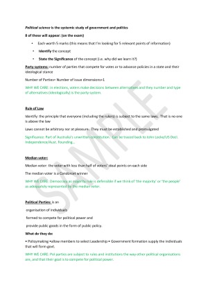 Full Semester range of Notes needed for the Final Pols1002 Exam (short and long answer) - relevant Definitions - answers to "state the significance question" for all definitions -topics covered: Median voter Cadre Party Collective Action Gerrymandering Free Riders Dictatorship Sovereignty Security Dilemma Political Parties Authoritarianism Judicial independence Mass Party Totalitarianism Individual Ministerial Responsibility Public Good Proportional Representation Liberal Democracy Federalism Collective Ministerial Responsibility Prisoner’s dilemma Party systems Rule of Law Long Answers (Compare and Contrast): Exit, voice, and loyalty Majoritarian vs. PR electoral systems MAD v NUTS Advantages and disadvantages of federalism Gerrymandering v. malapportionment Prime Minister v Presidential systems Median voter theorem vs. agenda setting State v nation 3 Theoretical approaches to studying parliament Colour Coded :)