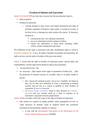These exam notes cover the workshops from the entire semester (i.e. Origin of Human Rights, UN Structure, Foundational Human Rights Treaties, various Human Rights and International Law). They also include case studies from international courts and General Comments from various UN committees that can be used as authority in the exam.