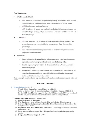 Week 1 - Introduction into Civil Litigation Week 2 – Case Management Week 3 – Preaction protocoles Lecture 4 & 5 - Defining the questions for trial & Pleadings Lecture 6 – (week 7) Interlocutory applications copy Lecture 7- (week 8) Evidence, Affidavits and Expert evidence Lecture 8 – Costs (week 9) (week 10 & 11) DISCOVERY Lecture 11 (Week 12) - Interim Injunctions Lecture 12- Set aside default & Summary Disposals