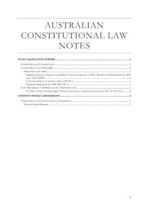 These notes provide succinct summaries of both the cases and principles of Australian constitutional law. They also include flow-charts which are especially useful in the Final Exam, on topics ranging from Implied Freedom proportionality testing to Constitutional Amendment. Topics Covered: 1. State Legislative Power 2. Constitutional Amendment 3. Separation of Commonwealth Judicial Powers 4. Separation of State Judicial Powers 5. The Executive 6. Constitutional Interpretation & Characterisation 7. Trade, Commerce & Incidental Powers 8. Corporations Power 9. External Affairs Power 10. Inconsistency 11. Implied Freedom of Political Communication These notes are ideal whether you are using them as a basis for your weekly lessons, or planning to utilise them in your exam. I also offer tutoring for Constitutional Law and find these notes make a remarkable difference to comprehension of a naturally difficult subject.