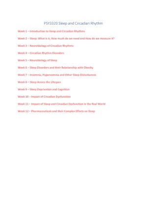 PSY3320 Sleep and Circadian Rhythm notes. Combination of lecture notes, textbook readings and additional diagrams and images. Organised weeks 1-12, including learning objectives. HD Standard