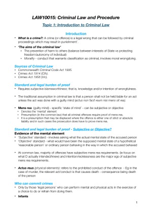 Course notes for the WHOLE course (2016, Semester 1), catered towards all assessments including: (1) the mid-sem test; (2) the moot; and (3) the final exam Topics 1-11: Detailed exam notes with case summaries included. (I used these exams in my exam and they helped me obtain a HD, they are extremely detailed but cover everything you need to know to sit the exam, they also contain all sections from the Crimes Act and all relevant cases) Topic 1: Introduction to Criminal Law Topic 2: Murder and Attempt Topic 3: Voluntary Manslaughter and Involuntary Manslaughter Topic 4: Sexual Offences Topic 5: Property Offences Topic 6: Criminal Law and Procedure Topic 7: Search, Seizure, Forensic Procedures, Finger Printing & Identification Evidence Topic 8: Police Questioning and Bail Topic 9: Sentencing Topic 10: Assault and Related Offences Topic 11: Commencement of Criminal Proceedings, The Machinery of Prosecution, The Trial Process and Defence Pleadings