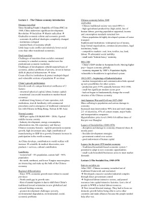 Comprehensive notes based on the material from all 13 weeks of online/face-to-face lectures and tutorials. Very clear, concise and has all lecturer commentary included. Has annotated graphs and tables. Diagrams and key concepts are included for all topics. These notes helped me do well and so would highly recommend them!! TOPICS INCLUDED: Chinese economy introduction, socialist era, economic transitions, Population, labour markets and human capital, The rural economy, Reforming and restructuring the corporate sector, Fiscal, Monetary and Exchange Rate Policies, financial system, Technology Policy and the Knowledge-based Economy, Entrepreneurship in the Australian and Chinese context, Theoretical Frameworks for emerging multinational enterprise’s (EMNE) Internationalization