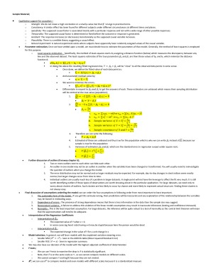 Notes include weeks 1-12 lectures and include notes from the assigned readings of the textbook. Relevant formulas are highlighted in yellow. Tutorial material is included where appropriate. Topics: Week 1: Introduction. Getting started with R. Simple Linear Regression (revision).Parameter interpretation/estimation Week 2: Matrix approach to linear regression. Properties of least squares estimators. Week 3: ANOVA. Hypothesis testing and interval estimation in a SLR context Week 4: Prediction intervals. Regression diagnostics (residual plots). Week 5: Outliers and influential observations. Scale transformations. Week 6: Introduction to Multiple Regression. Model interpretation and estimation. Week 7: Model interpretation continued (discussion of causality) Week 8: ANOVA for multiple regression. Sequential sum of squares. Week 9: Hypothesis testing, confidence intervals and prediction for multiple regression Week 10: Model diagnostics. Outlier detection. Types of residuals. Influence diagnostics. Multicollinearity. Week 11: Model selection and criteria for comparing models. Week 12: Review/Additional material