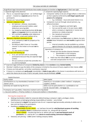 - Extremely useful for Open Book Exam with cases highlighted, key points colour coded, table formatting and step-by-step guides - Helped me attain H1 in this subject - Includes the following topics: 1. The legal nature of companies 2. Business planning; Constituting companies 3. Decision making in companies 4. Member meetings and restrictions on decision making 5. Transacting by companies 6. Company directors' and officers' duties 7. Consequences of breach of duty 8. Members' remedies 9. Share and capital maintenance 10. Reporting and disclosure