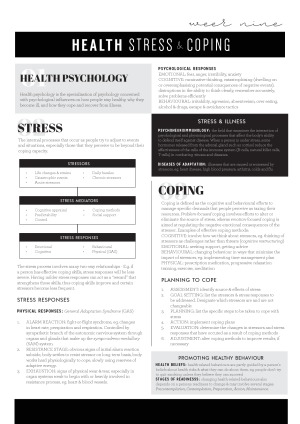 Thoughtfully designed notes for the visual learners, designed by a graphic designer. In studying for this exam I tried to condense each week's topic/chapter to a page or two for easier learning, figuring it would be easier to absorb and engage with aesthetically satisfying notes that fit on one page rather than standard notes spread over many pages in a plain word document. Combines module content with in-depth summaries and diagrams from readings. Topics covered: Introduction to Psychology Biological Aspects of Psychology Sensation Perception Consciousness, Sleep & Dreams Altered States of Consciousness Personality Health, Stress & Coping Emotion Psychological Disorders Treatment of Psychological Disorders Received a HD for this unit and will be making notes like these to study for each of my exams as I progress through my psych journey. I originally designed these to be printed out and used as a supplementary to flash cards. Hope they help. :-)